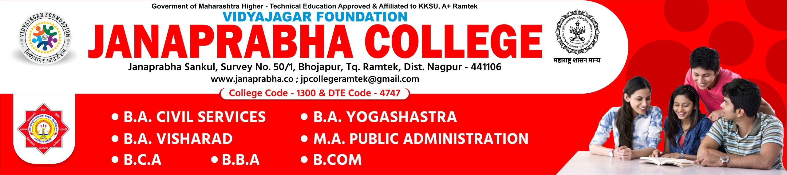 Welcome to Janaprabha College, Ramtek – a beacon of learning nestled in the serene rural heart of Ramtek taluka, Nagpur District, Maharashtra. Affiliated with Kavikulaguru Kalidas Sanskrit University (UGC recognized and NAAC A+ accredited), our college offers diverse courses such as BCA, BBA, B.Com., BA Civil Services, BA Yoga, BA Sanskrit, and MA Public Administration.